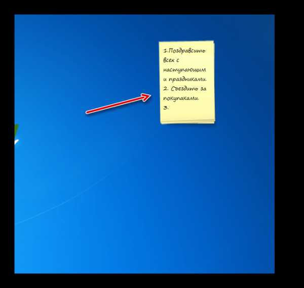 - Записку можно перемещать по всему Рабочему Столу. Для этого нужно подвести курсор мыши к верхней ее части, зажать левую кнопку, после этого перетащить напоминание в нужную область экрана.
