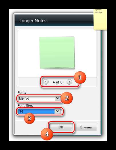 - Регулировка цвета интерфейса осуществляется точно так же, как и в Chameleon Notescolour, но в Longer Notes, кроме того, имеется возможность изменить тип шрифта и его размер. Для этого, соответственно, из выпадающих списков «Font» и «Font Size» необходимо выбрать приемлемые варианты. После того как все нужные настройки выставлены, не забывайте нажать «OK», иначе изменения не вступят в силу.