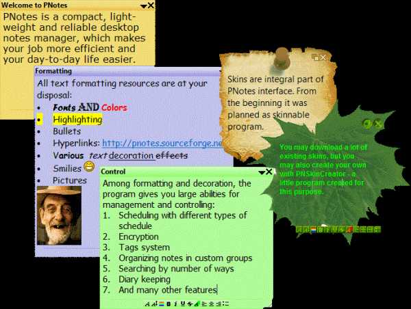 Приложение PNotes схоже по функциям с предыдущим и имеет практически те же возможности управления заметками. Распространяется эта программа в двух вариантах – в портативном и с инсталлятором. При добавлении графики в стикер не стоит загружать большие изображения с высоким разрешением, PNotes.net из-за этого может зависать на время и тормозить до тех пор, пока не прекратится загрузка изображения.