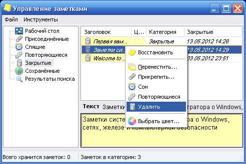 Кстати, все созданные когда-либо записки после закрытия не удаляются. Их можно просмотреть, если щелкнуть по желтому значку программы Stickies в трее и выбрать “Управление заметками”. В открывшемся окне вы можете управлять вашими записками (восстановить, удалить и т.п.).