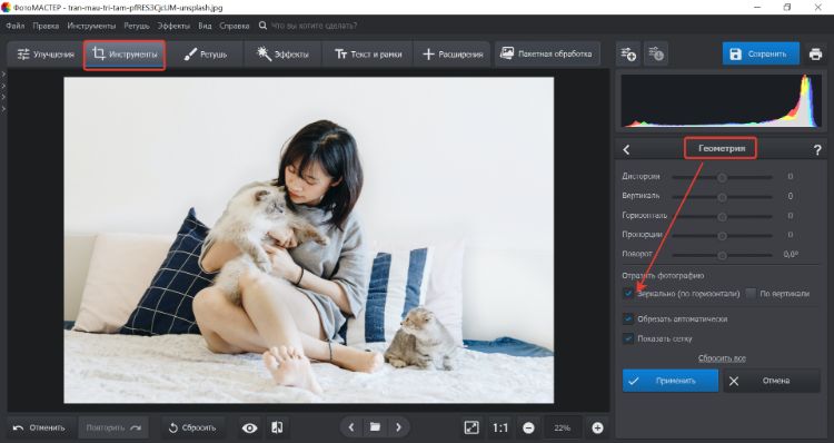 Flip Horizontal/«Отразить по горизонтали» — позволяет отразить фотографию по горизонтали.