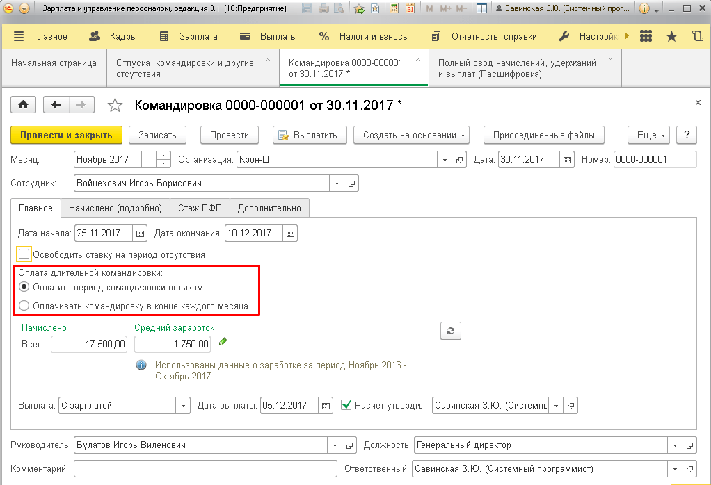 Рис. 4. Вкладка «Начислено (подробно)» в документе «Отсутствие с сохранением оплаты» в программе «1С:Зарплата и управление персоналом 8» ред. 3