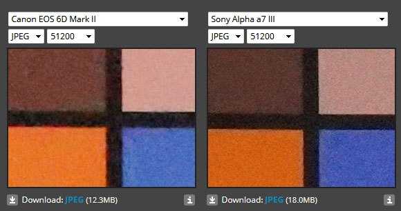 У камеры 6D Mark II немного более высокое разрешение сенсора, а у A7 III максимальная чувствительность на одну ступень выше. Как вы можете видеть в тесте на высокой чувствительность, изображение 6D Mark II выглядит несколько хуже по сравнению с A7 III. Возможно это связано с одним дополнительным стопом динамического диапазона модели A7 III.