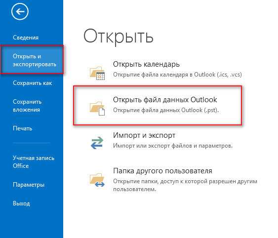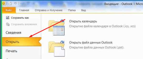 Теперь чтобы подключить два архивных файла в программе Outlook переходим в пункт Файл – вкладка Открыть и экспортировать – Открыть файл данных Outlook (.pst)