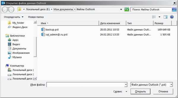 При выборе данного пункта появляется диалоговое окно с выбором подключаемого файла, допустим вновь созданный архивный файл называется archive22.pst, а старый backup.pst – значит нам необходимо выбрать backup.pst