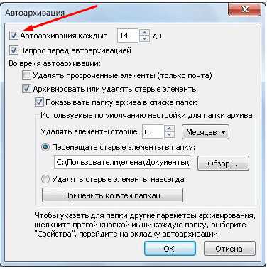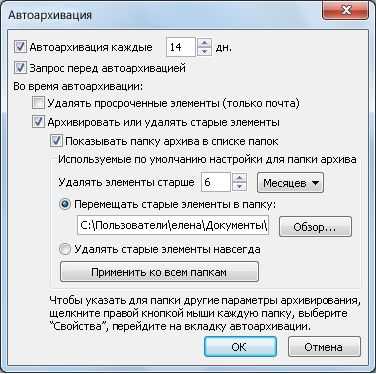 Примечание: если вы выбрали удаление элементов, они не архивируются. Если же выбрано архивирование элементов, их невозможно удалить с помощью функции автоархивации. После архивации элементы можно удалить только вручную.