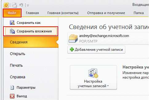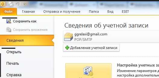 Увидеть папку хранения PST или OST файла конкретного аккаунта можно также с помощью самого Outlook. Для этого перейдите в меню Файл / Настройка учётных записей.
