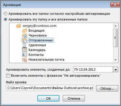 В открывшемся диалоговом окне архивации, вы можете выбрать для архивации как всю папку “Входящие”, так и любую другую папку или подпапку. Далее, выбираем дату, до которой Вы хотите заархивировать почту.
