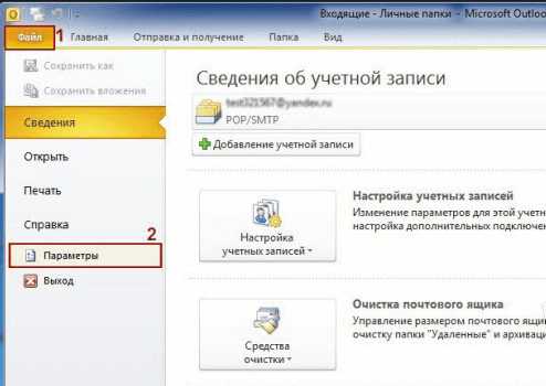 Для того, что настроить автоархивацию, Вам необходимо щелкнуть вкладку Файл, затем выбрать Параметры.