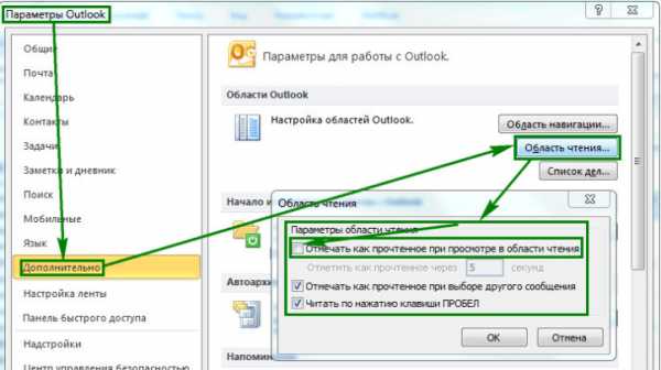 Переходим к дополнительным параметрам Outlook - Кликните по кнопке «Область чтения». Уберите галочку с параметра «Отмечать как прочтённые при просмотре в области чтения» и сохраните внесённые изменения.