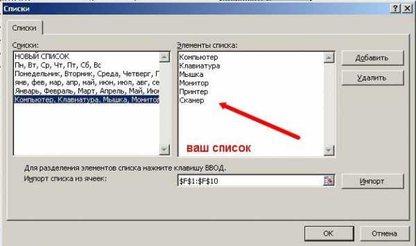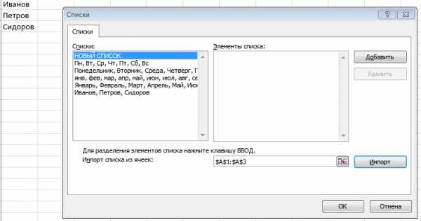 Как видно, их не много. Но легко добавить свой собственный. Можно воспользоваться окном справа, где либо через запятую, либо столбцом перечислить нужную последовательность. Однако быстрее будет импортировать, особенно, если данных много. Для этого предварительно где-нибудь на листе Excel создаем перечень названий, затем делаем на него ссылку и нажимаем Импорт.