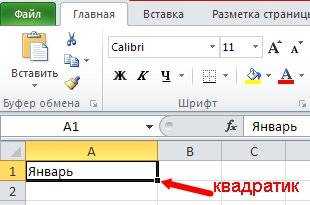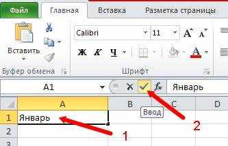 Пишем в ячейке А1 слово «Январь» (естественно без кавычек и можно с прописной буквы) и щелкаем мышкой по кнопке «Enter» (или галочка на панели инструментов в Excel).