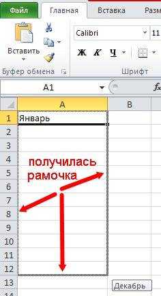 Указатель мыши должен измениться с белого креста на маленький черный крестик. Как только это произойдет, нажмите на левую клавишу мыши и, не отпуская её, переместите указатель на ячейку А12. У вас получиться вот такая рамочка.