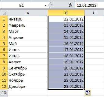 Напишем в ячейке В1 дату – 12.01.2012 – и, установив указатель мыши на маркер заполнения, выделим диапазон ячеек В1:В12.