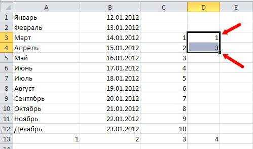 Например, если требуется задать последовательность 1, 2, 3, 4, 5…, введите в первые две ячейки значения 1 и 2. Если необходима последовательность 2, 4, 6, 8…, введите 2 и 4.