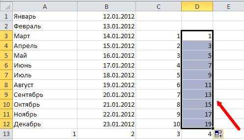 Автоматическое заполнение ячеек также используют для продления последовательности чисел c заданным шагом (арифметическая прогрессия). Чтобы сделать список нечетных чисел, нужно в двух ячейках указать 1 и 3, затем выделить обе ячейки и протянуть вниз.