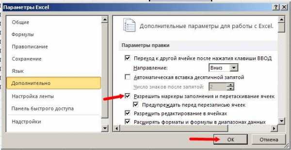 Выберите на ленте – Файл – Параметры – Дополнительно – и установите флажок на Разрешить маркеры заполнения и перетаскивание ячеек.