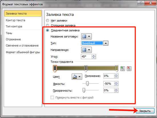 Если на него нажать, откроется окошко «Формат текстовых эффектов» на вкладке «Заливка текста». Подберите в нем подходящие параметры для градиента и нажмите «Закрыть».