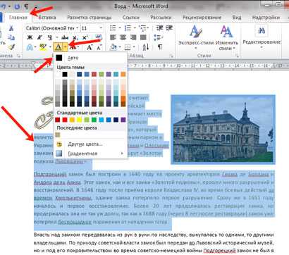 Выделите мышкой тот фрагмент текста, который нужно закрасить. Затем на панели быстрого доступа нажмите на стрелочку возле буквы «А» – это кнопка «Цвет текста», и выберите из выпадающего списка любой понравившийся.