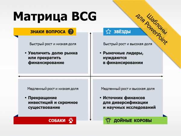 Сегодня в рубрике бесплатных шаблонов для PowerPoint известный инструмент управления бизнесом — матрица BCG. Матрица разработана Брюсом Хендерсеном (основателем компании BCG) для анализа продуктов в зависимости от роста рынка и занимаемой доли.