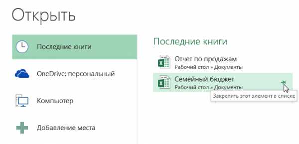 Похожим образом в представлении Backstage можно закреплять еще и папки для быстрого доступа к ним. Для этого, находясь в представлении Backstage, перейдите на вкладку Открыть и выберите Компьютер. Найдите папку, которую требуется закрепить, и нажмите на значок канцелярской кнопки.