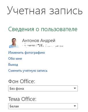 На вкладке Учетная запись Вы можете получить информацию о Вашей учетной записи Microsoft, изменить тему или фон программы и выйти из учетной записи.