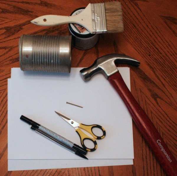 - Как только вы подберете подходящие жестяные банки, позаботьтесь также о том, чтобы молоток был не очень тяжелым, ведь вам придется сделать множество отверстий в банках. Подготовьте также все необходимые материалы, включая полотенце, которое поможет вам прочно держать банку. Также рекомендуется наполнить банку водой и поставить в морозильную камеру на ночь, прежде чем вы начнете мастерить.