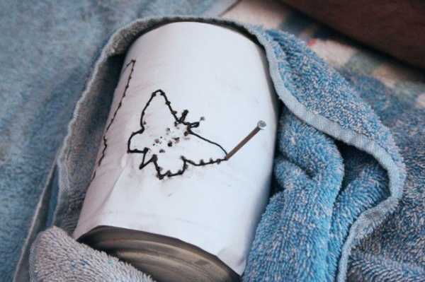 - Теперь самое время наносить точечный рисунок с помощью молотка и гвоздей. Воспользуйтесь полотенцами, чтобы зафиксировать банку. Не забывайте о том, что в банке находится лед, поэтому полотенца также защитят руки от охлаждения. Также лед необходим для того, чтобы создать некое сопротивление для гвоздей, чтобы не погнуть жестяную банку.