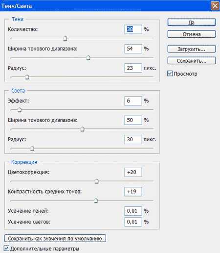 Шаг 2. Применяем команду Изображение – Коррекция – Света/Тени (Image – Adjustment – Shadows/Highlights).