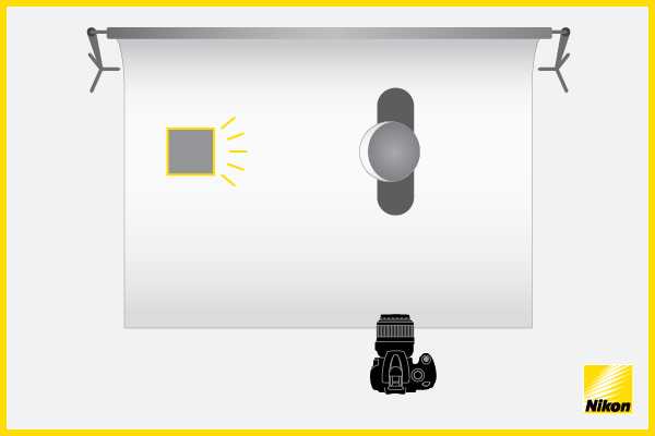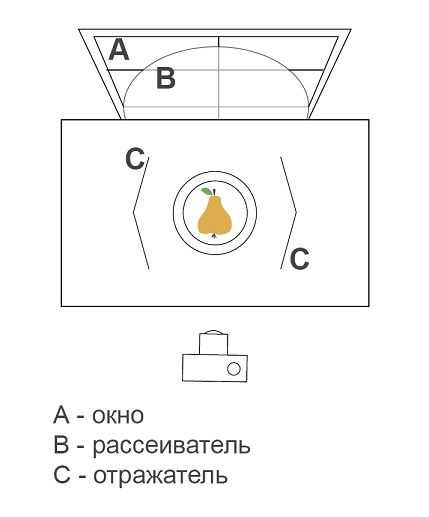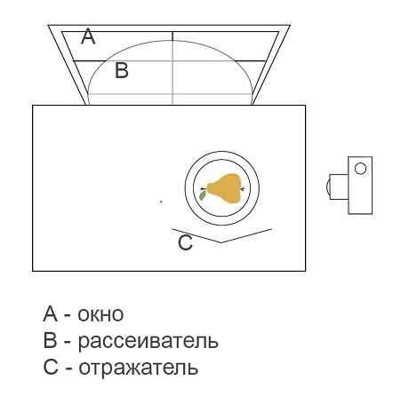 Ниже — схемы, показывающие расположение объекта съемки, источник света и отражатель.