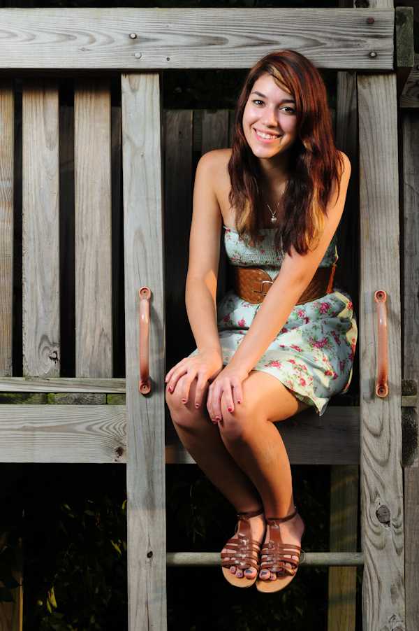 Как видите, лицо и тело модели по-прежнему освещаются солнцем с правой стороны, но теперь солнце является не основным источником света. Вспышка заполняет светом все тени, и также выравнивает экспозицию на древесине вокруг модели. Солнце прекрасно освещает волосы модели и придает тёплые оттенки ногам, но при этом мало что делает для её лица.