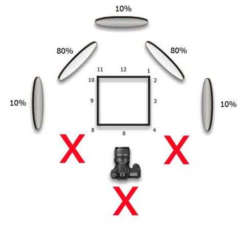 — в точках 3 и 9 — боковой свет (тоже в 10%)