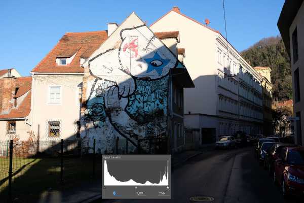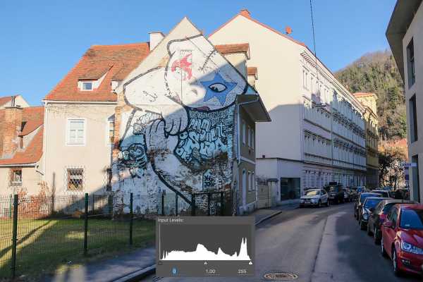 На изображениях, где применялся режим EXR, хорошо сохранена тональная детализация, которая была частично потеряна в стандартной версии снимка. Хотя, более темные участки, например, тени на дверях, выглядят слишком резко. Как показано на гистограмме, в режиме D-Range и светлые и темные места снимка выглядят темнее, в светлых областях снимка это повышает детализацию, в темных — понижает.