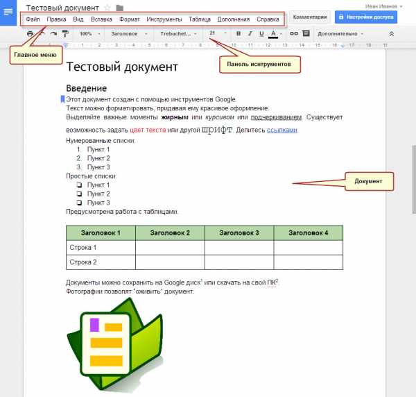 Итак, начнем знакомство с Google Docs. Документы Google (Google Docs) — онлайн сервис, позволяющий создавать, загружать, редактировать документы, а также управлять совместным доступом к этим документам. С помощью данного сервиса вы сможете создать текстовые документы, электронные таблицы и презентации.