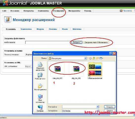 2. В блоке Загрузить файл пакета нажимаем кнопку Обзор, находим нужный файл, например, файл плагина Media Manager — jce_mediamanager_156.zip, и нажимаем кнопку Загрузить файл & Установить.