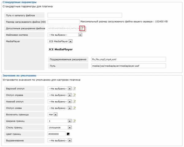Особенно акцентирую ваше внимание на параметр Допустимые расширения файлов. Очень важный параметр, скрытый за неприметной кнопочкой. Очень долго я мучился, не понимая, почему редактор JCE-Editor не видит архив RAR. Данного расширения просто нет в настройках по умолчанию. Поэтому рекомендую внимательно относится к этой кнопке в настройках всех плагинов этого редактора. Так как не все используемые вами форматы на сайте могут там быть. Добавляется формат через кнопку добавить.