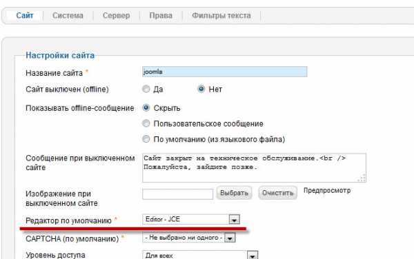 Для включения визуального редактора Joomla Content Editor войдите в административный раздел — Сайт — Общие настройки — Визуальный редактор по умолчанию. В выпадающем списке выберите Editor-JCE. Сохраните изменения.