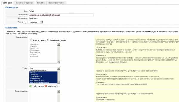 В принципе здесь то же можно все оставить по умолчанию. Единственное что, это вы можете назначить Группы пользователей для отображения редактора.