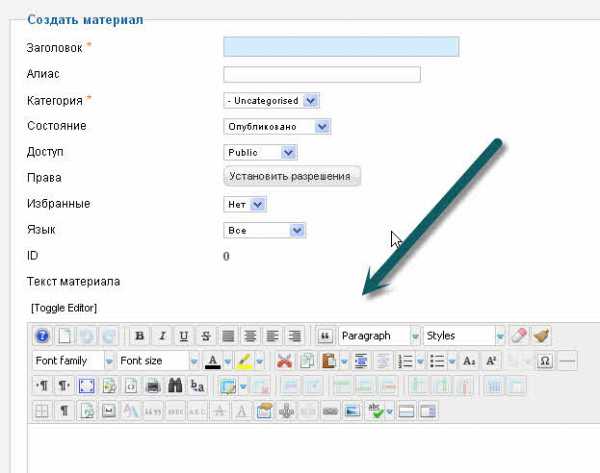 Сегодня мы научимся устанавливать более наглядный редактор для редактирования наших материалов. Давайте, например, попробуем создать новый материал. Здесь, как вы знаете, нужно вбить заголовок, выбрать категорию. Когда мы перейдем вниз, мы увидим такой редактор, который не очень функциональный. Здесь есть немного разных настроек и поэтому достаточно сложно им пользоваться.
