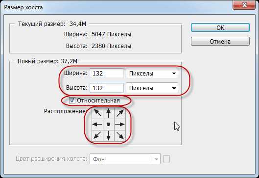 Идём по вкладке Изображение —> Размер холста (Image —> Canvas Size), это открывает диалоговое окно инструмента. В поля ввода «Ширина» и «Высота» следует ввести значение, вдвое большее расстояние между фото, т.е. 66*2=132 пикселя, кроме того, стрелки инструмента «Расположение» (Anchor) должны быть так, как показано на рисунке? а галка опции «Относительно» (Relative) проставлена: