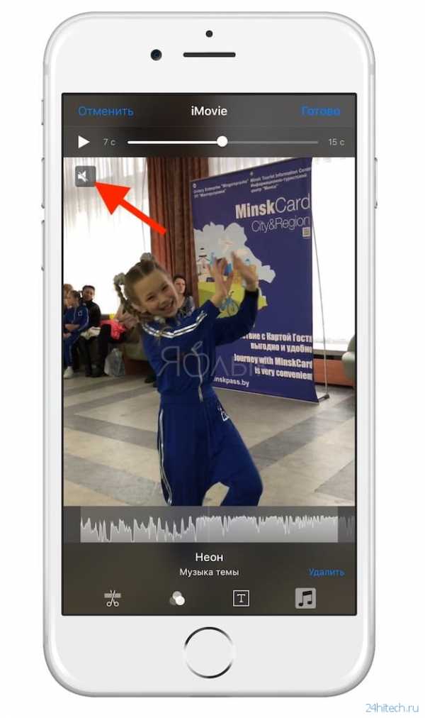 6. Чтобы отключить звук на оригинальной дорожке видео, нажмите на кнопку с изображением динамика.