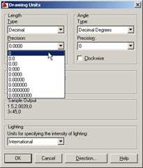 Точность представления данных устанавливается в диалоговом окне Drawing Units (Единицы чертежа) с помощью раскрывающихся списков Precision (Точность):для линейных величин – раздел Length (Линейные), а для угловых – Angle (Угловые). Указанное количество нулей после запятой характеризует точность исчисления (рис. 2.5).