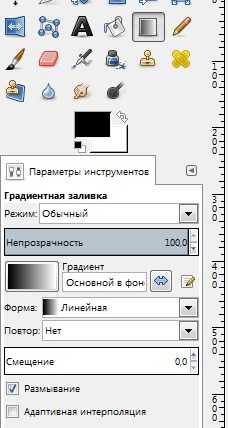 Выбираем инструмент «Градиент» с настройками по умолчанию и применяем его к маске верхнего слоя. При этом, двигаемся с права налево примерно вот так.