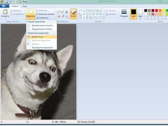 - Перейдите в окно программки со вторым изображением которое вы желаете соединить. Нажмите на кнопку «Выделить» и изберите пункт «Выделить всё». После нажатия на него вокруг всего изображения появится пунктирное выделение. Нажмите кнопку «Копировать» на панели инструментов либо сочетание кнопок на клавиатуре Ctrl+C.