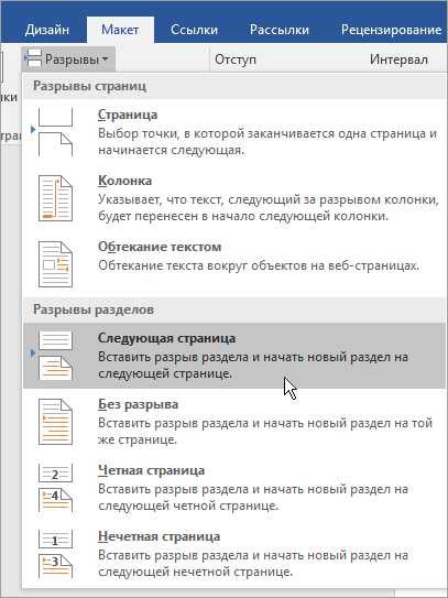 Разрывы устанавливаются в любом месте в тексте. Данная команда нужна для завершения одного раздела и начала нового. С нового раздела можно начать новую главу, можно для каждого раздела установить различные параметра оформления: поля, ориентацию, колонтитулы, размер и вид шрифта, и другие. Для того, чтобы сделать разрыв, нужно установить курсор после текста и выбрать команду «Страница».