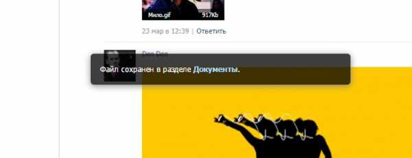 После чего, изображение автоматически добавится в ваши загруженные [Документы], это действие будет сопровождаться, характерной надписью, во всплывающем окне с активной ссылкой [Файл сохранен в разделе Документы]. После этой, нехитрой операции, вы можете воспользоваться левым меню веб-сайта вконтакте, а именно активным полем [документы], чтобы посмотреть все сохранённые вами файлы.