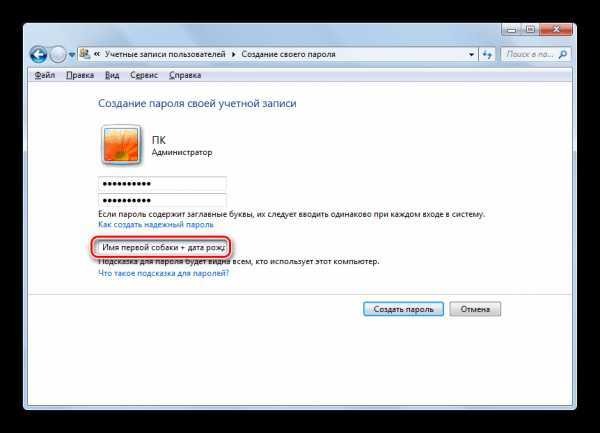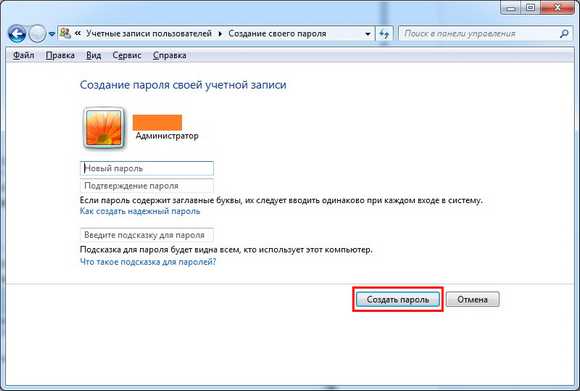 - Манипуляции со следующим окном аналогичны тем, которые выполнялись при решении задачи раздела с инструкцией о том, как поставить пароль на компьютер под управлением Windows XP. Кодовую последовательность необходимо ввести 2 раза, по желанию создать текст подсказки-напоминания и нажать на кнопку Создать пароль.