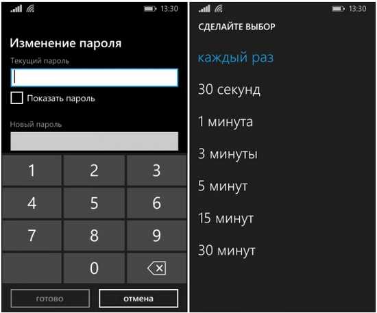 - В появившейся форме следует 2 раза вбить защитный код или повторить существующий, если он был поставлен ранее. Дублирование ввода требуется для защиты от случайной опечатки. Следующее поле позволяет настроить частоту, с которой смартфон будет запрашивать ввод установленного пароля.