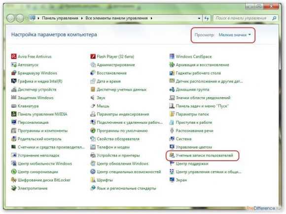 После этого в верхнем правом углу из выпадающего списка выберите «Мелкие значки». Кликните по вкладке «Учетные записи пользователя».