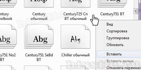 Затем идем в папку Fonts, жмем правой мышкой на белое поле между файлами (не на файл!), выбираем команду Вставить.